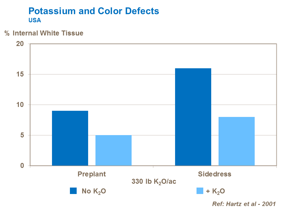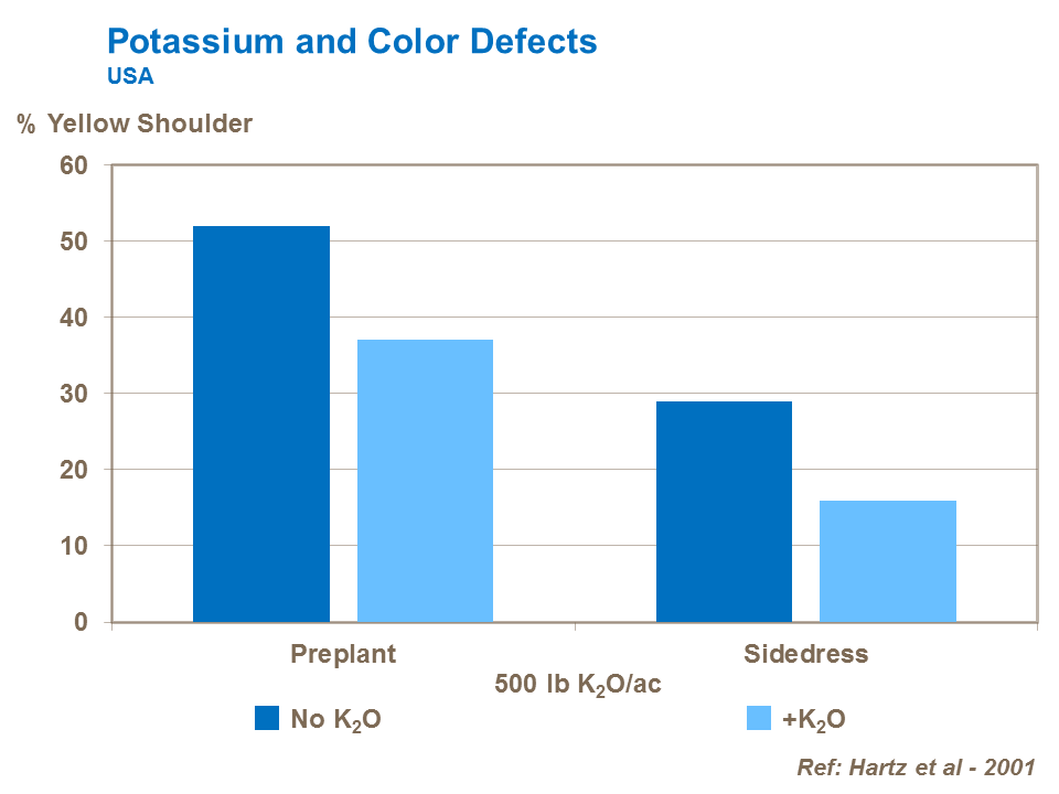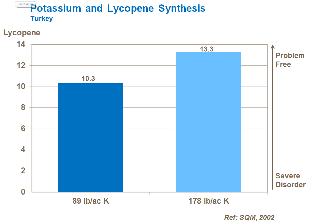Low levels of potassium can lead to poor coloration in tomatoes and reduced lycopene synthesis.