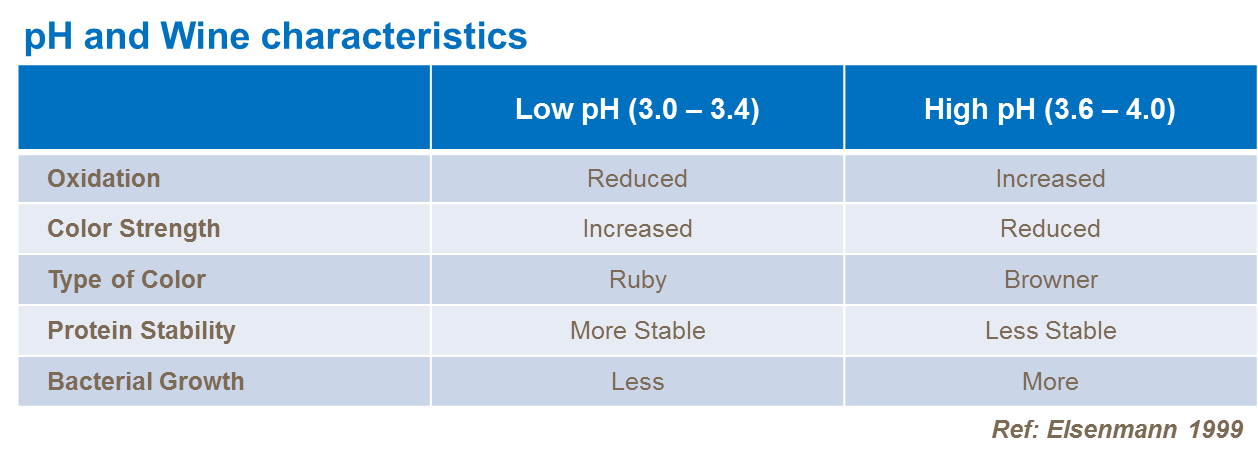 Similarly, too much uptake of these nutrients, as a result of good water availability, will also spoil wine quality through increasing pH. The pH of the juice/must affects the taste, sugar/acid balance and stability of wines. It is determined by the balance of the major anions (malate and tartrate) and presence or absence of major cations (mainly potassium). Harvest timing and management also effects wine pH. The pH can increase by as much as 0.2 units between harvest and delivery.