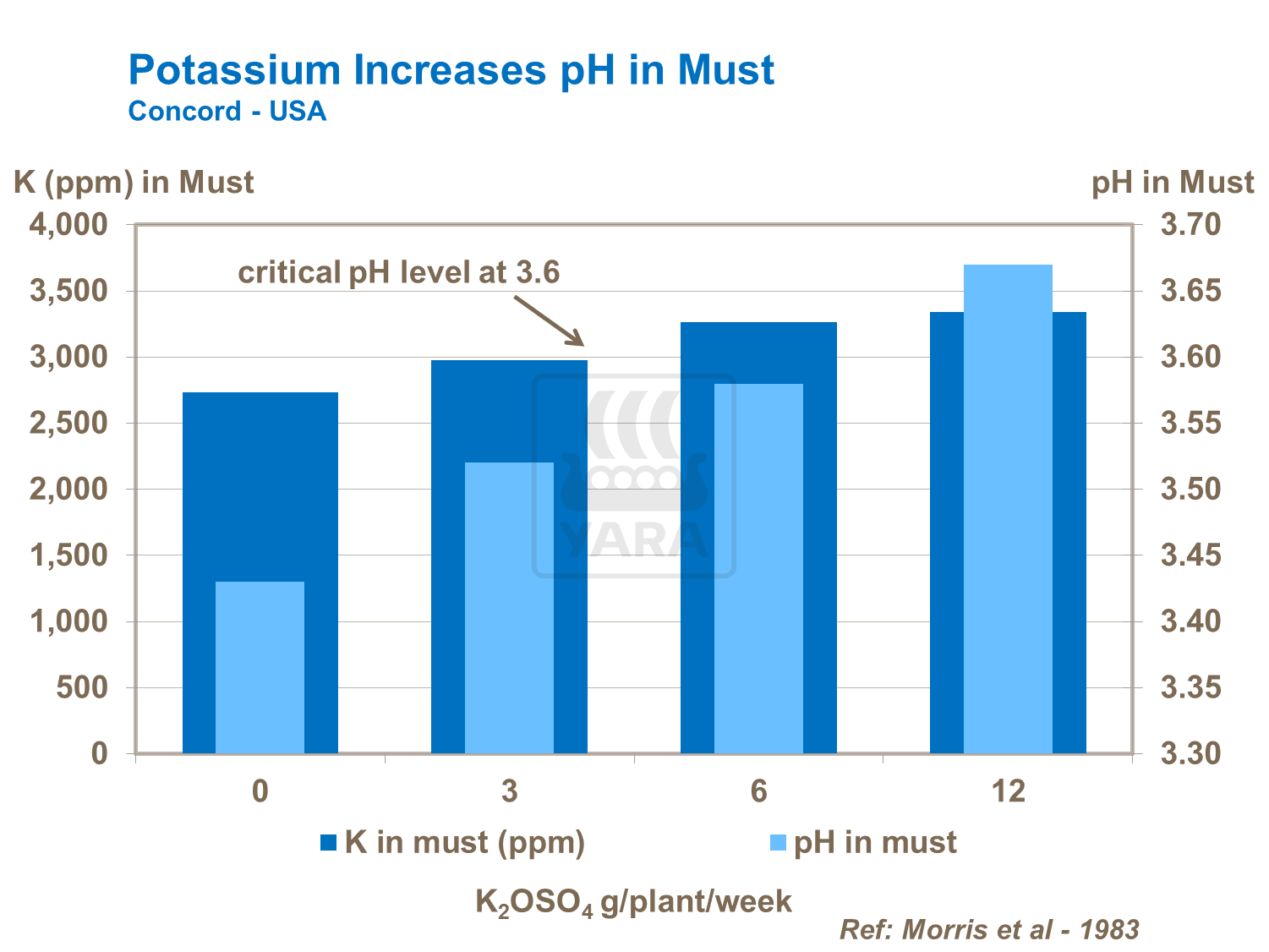 There is a strong relationship between potassium and grape and wine pH. Too much potassium results in a high wine pH and a poorer quality wine.