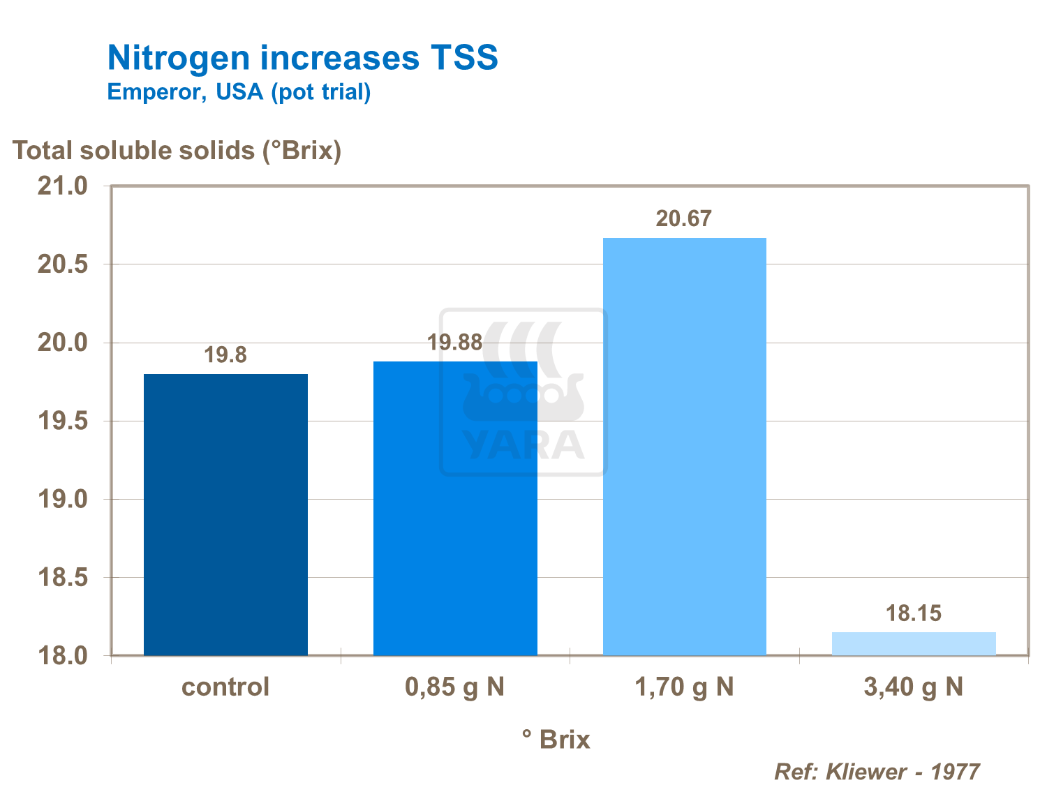 Considering nutritional aspects, the higher the availability of nitrogen, the higher the sugar content of the grape and the potential alcohol yield after fermentation, as well as the residual sugars in the wine, as measured by °Brix. Up to certain levels, nitrogen-use increases Total Soluble Solids.